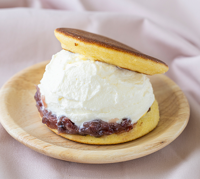 さつま芋ペーストを加えたたっぷりのホイップクリームの上には、ホクホク食感のさつま芋をトッピング。さらにコクのあるカラメルソースをとろりとのせた、季節限定のどら焼きです。